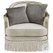 Shape and finish define this collection. Hand applied nail heads outline the curved wood scroll designed frame. Plush chenille seat cushions combined with medallion pattern on the outside back create a focal point in your room. Luxurious down blend toss pillows in medallions, silk, and a touch of faux fur are complemented with silky fringe with ribbons. Lustrous bullion fringe skirt completes the look. English arm skirted accent chair is topped with top grain leather and shown in rich medallion patterned chenille with a fringed silk toss pillow. Scroll carved accent chair features hand carved design.