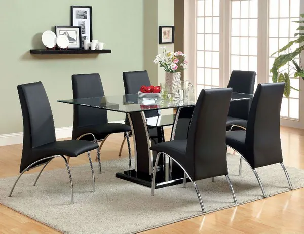 Curves define the foundation of this sophisticated dining set. The sweeping sides of the lacquer-coated table and the arched chrome chair legs combine to bring a modern feel to any space. The table and matching leatherette chairs come in gray, black, or white.