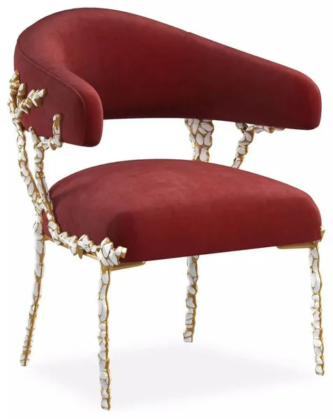 Bold in character, this dazzling chair is unique in every way. Its one-of-a-kind shape was born from design exploration of the organic beauty and inspiration found in nature. Cast in solid brass and finished in Gold Brush with white enamel, it has the feel of branches or coral reaching up toward the light. Richly upholstered in a soft, textured neutral, this remarkable creation conveys an attitude of modern opulence.