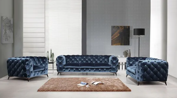 JNM is proud to present the Glitz Sofa Set. This modern interpretation of the timeless chesterfield sofa is hand sewn using Velour Fabric to enhance the detail and quality of the tufted cushions. Gun powder graylags contrast the majestic velour which comes in a royal blue, or imperial purple. This set can be ordered in a wide array of fabrics.