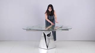 This table has a 1/2" thick, tempered glass top with two motion-activated extensions, easily opened by one person from 59" to 86" with self-guided tracks for simple and smooth movement, mounted on a polished stainless steel pedestal base, making it a conversation piece and bring elegance and style to any contemporary space. This table has a 1/2" thick, tempered glass top with two motion-activated extensions, easily opened by one person from 59" to 86" with self-guided tracks for simple and smooth movement, mounted on a polished stainless steel pedestal base, making it a conversation piece and bring elegance and style to any contemporary space.Features
