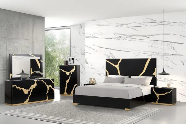 Goldsberg Black and Gold Panel Bedroom Set with Extended Panel