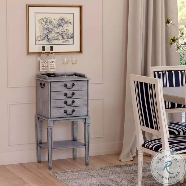 Hardwick Collection from Butler. Select hardWoods and Wood veneers to make up this gorgeous chest with four way matched veneer top and veneer end grain border. This is the perfect addition to your dining room for storing your heirloom flatware or serverware or even using it to store your jewelry in your bedroom or closet. The four graduated drawers provide ample storage, while the tall legs and slender design allow this to fit in most spaces. Side handles and a finished back allow for easy mobility of the unit. There are felt lined drawers to keep your possessions safe inside for years to come.