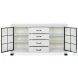- Buffet features 2 metal framed textured glass doors, 2 adjustable removable reversible shelves for wine storage behind left door, 2 adjustable wood shelves behind right door, 4 center drawers with 1 felt lined top drawer, support leg with levelers, Maximum Weight Capacity: 200lbs. Top and Maximum Weight Capacity: 100lbs. Each Shelf