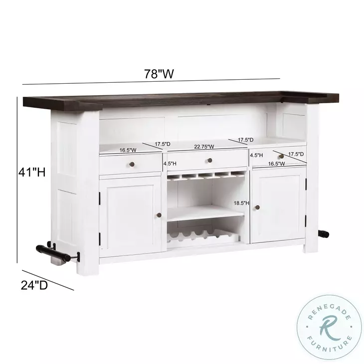 Introducing the Harrison Bar, a captivating centerpiece that seamlessly blends functionality and style. Finished in a white distressed tone, this bar exudes rustic charm while maintaining a timeless appeal. The dark brown bar top adds a touch of sophistication, providing the perfect surface for serving your favorite beverages. With its thoughtfully designed layout and ample storage space, the Harrison Bar ensures that everything you need is within reach, making hosting and entertaining a breeze. Elevate your home entertainment experience with the Harrison Home Bar, where convenience meets rustic elegance in perfect harmony.Features