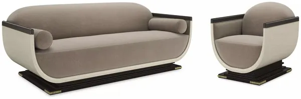 A modern interpretation of classic Roman shapes, this sofa is remarkable for its length and deep-scooped wood frame with an Ivory Craze crackled finish that is trimmed with Brushed Gold paint. The frame is perched on a wood-tiered base in Charred Bark with Brushed Gold metal corner appliques. This regal chairs inside frame and plush cushion showcase a faux mohair velvet fabric in Mushroom.
