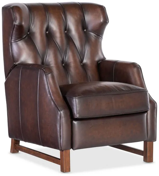 Classic with chic detailing, the Henderson Collection Press Back Recliner has wing-style back with diamond-like button tufting on the back and welt trim, along with square wood legs in a medium finish. Covered in the Nature semi-aniline top-grain leather, it features manual push-back recliner.