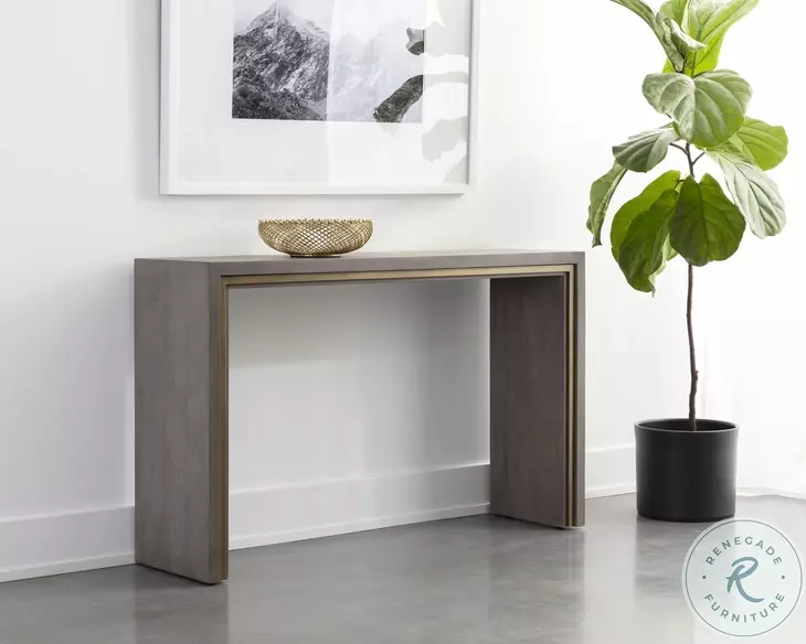 The Hilbert Console Table is grounded in a functional modern design. Crafted from grey acacia wood, this console table features a sharp linear silhouette. A brass iron trim on the front and the back of the piece provides added dimension and intrigue to the overall look. As wood is an organic, porous material, these pieces will contain natural variations of texture and may also exhibit fine indentations and cracks. Wood pieces will also display a disparity of colour and grain, and visible knots and burls that add to the character of each piece.Features