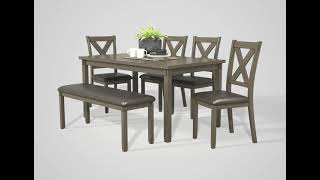 Designed in the transitional style for your casual dining space, the Holders Dining Set will be a welcome space for your friends and family to gather during meals and social activities. The convenient 6-piece packaging of the collection includes a table, four chairs and a bench. X-back, wood frame chairs perfectly complement the understated design of the table. Light, neutral tone seats create complementing contrast to the gray finish of the collection.Features