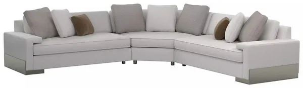 Create a destination in your home with the refined character and comfort of this stunning sectional sofa. Unique by design, its seat cushions nest under a wide shelf-arm creating statement-making style. Destined to be a favorite spot for resting and relaxing, this sectional is upholstered in a neutral, linen-like fabric with a small, modern herringbone pattern. An angular wood base finished in Pyrite cradles the frame and imparts a finishing touch that grounds its design presence.