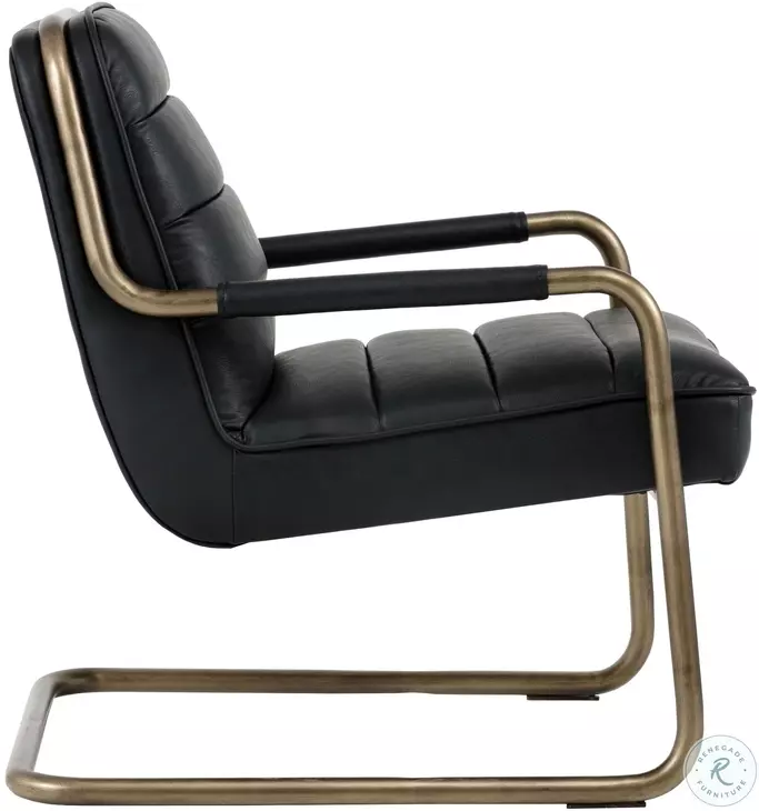 This retro-inspired lounge chair from our Irongate collection is perfect for lounge, living and office spaces. Handsomely designed with an exposed cantilever steel frame in a rustic bronze finish and horizontal channel tufting on the seat and seat back. Stocked in a masculine vintage black, cognac and blue faux leather, or a beige linen fabric. Suitable for contract and residential environments.Features