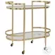 A refined serving cart, forged with a beautiful soft gold leaf finish made completely from iron. The two tray style glass shelves allow the beauty of your glassware and bottles to shine through. Complete with rolling and locking casters.Features