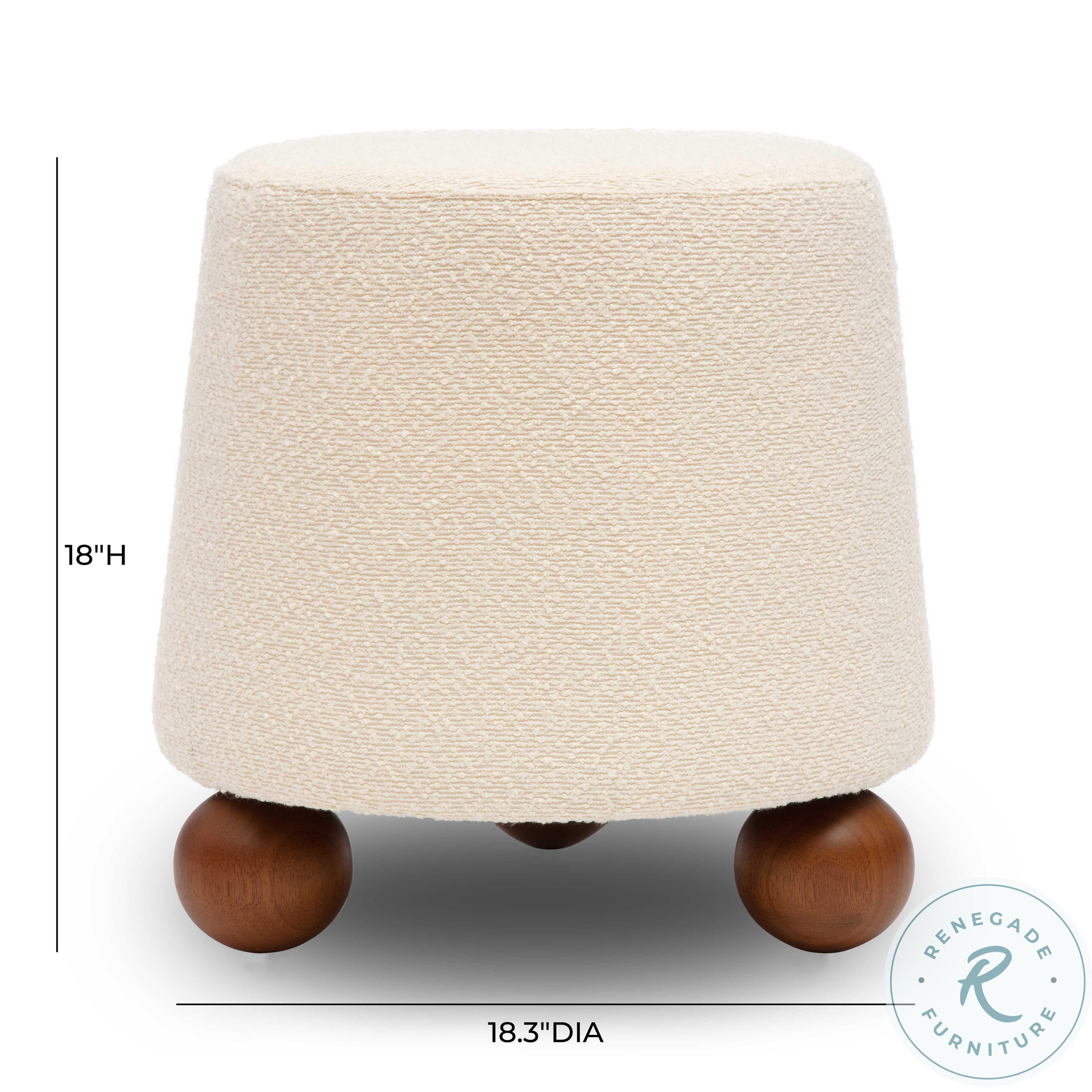 Add a playful charm to your space with the Jaine Boucle Stool, boasting a slightly conical shape that catches the eye. Its spherical solid wood legs provide a sturdy base, while the nubby boucle upholstery (available in chocolate brown, cream, or forest green) adds a modern, textured touch. Not only is it on-trend with its color palette, but this ottoman also seamlessly blends contemporary style with a tactile experience, making it a must-have for any room.Features