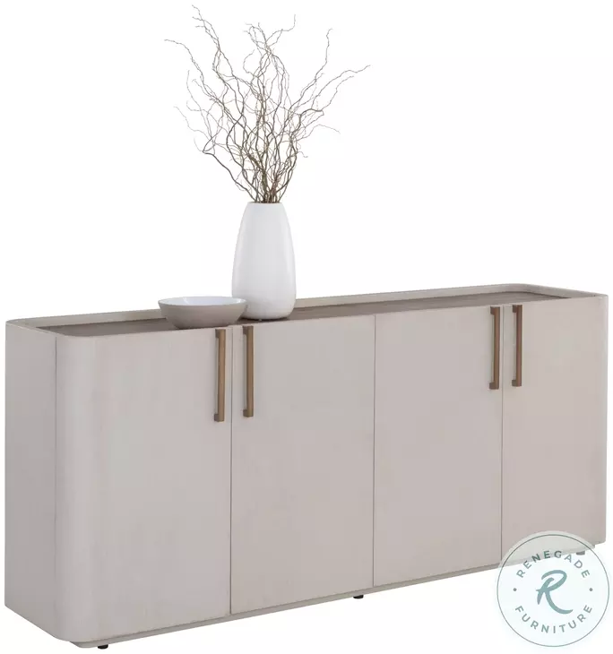 This contemporary sideboard is defined by its beautiful and gentle curves. Upholstered in cream faux leather with a brown oak veneer table top that is sure to impress. Includes four cabinets and completed with a rustic bronze steel base. Coordinating console table, desk, and media console and cabinet also available. Handle With Care: This design has been crafted with faux leather. Faux leather is manufactured to reflect the natural characteristics of leather; as such, colour variations, markings wrinkles, grooves, and light scratches are appreciated characteristics. No two pieces will be alike. Visit our Product Care page for more information on how to ensure the lasting beauty of this piece.Features