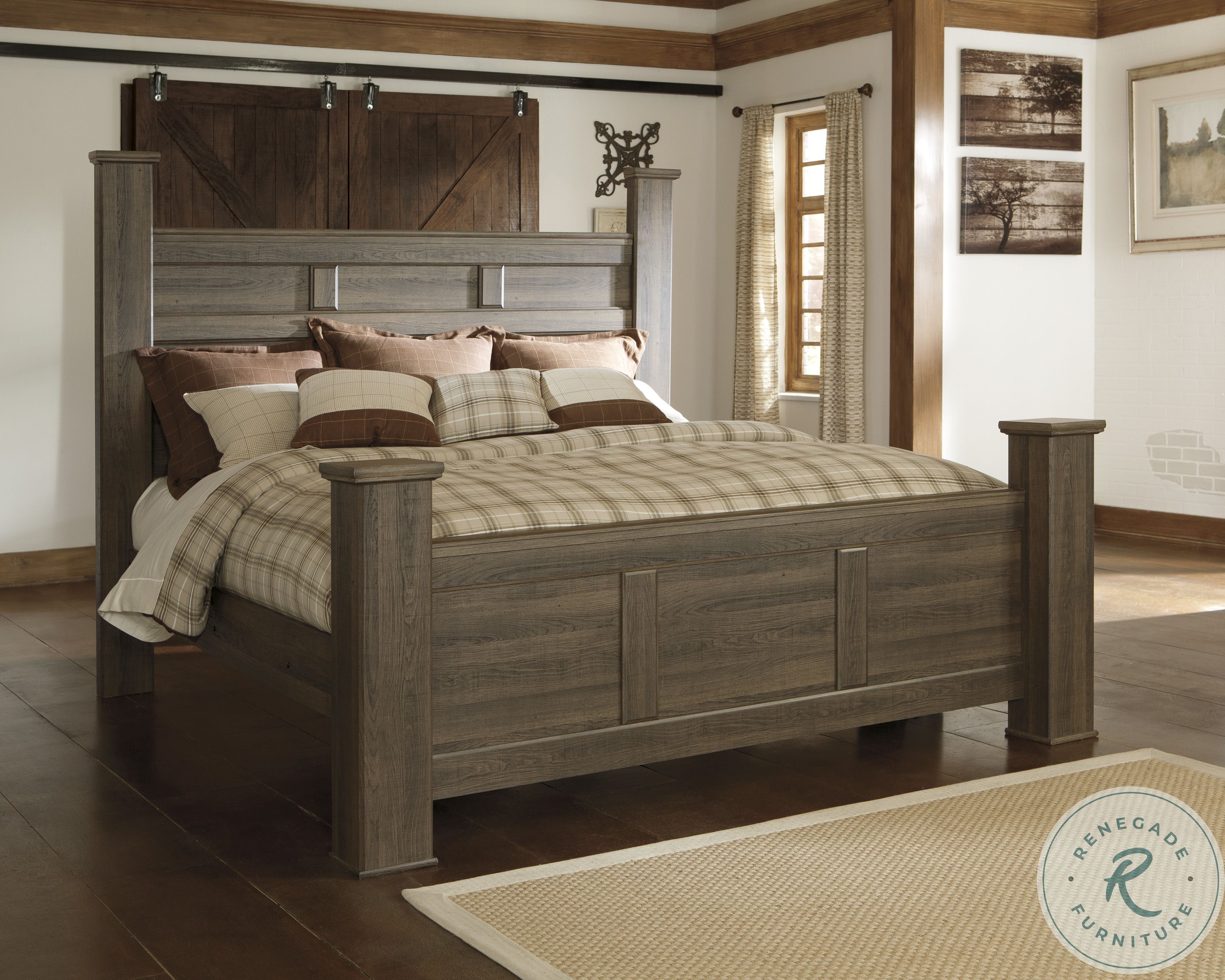 Get the look of posh barn wood without setting foot in a salvage yard. Replicated rough-sawn oak of this California king poster bed has a vintage-style finish that is reminiscent of a timeworn family heirloom. Warm, rustic and naturally beautiful, it’s just got that ageless appeal. Mattress available, sold separately.Features