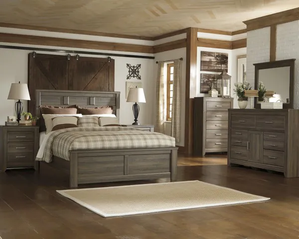 The beauty of Vintage Casual design come to life with the aged brown rough sawn finish flowing over a replicated oak grain along with the case pilaster detailing and warm pewter color hardware making the Juararo bedroom collection the perfect way to create that cottage getaway within the comfort of your home.