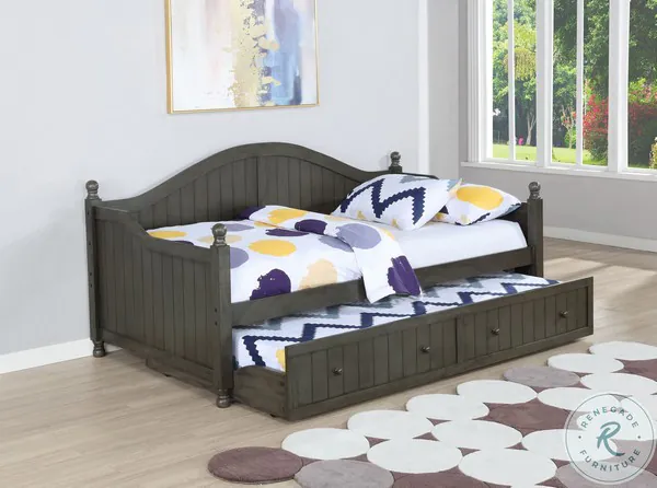 Begin transforming any bedroom space by adding this Julie Ann Collection from Coaster Furniture daybeds has an elegant curved back so you can toss pillows against lean back and relax. The bottom trundle comes with pretty little knobs making it easy to pull out to accommodate overnight guests. Add this collection for a fresh look.