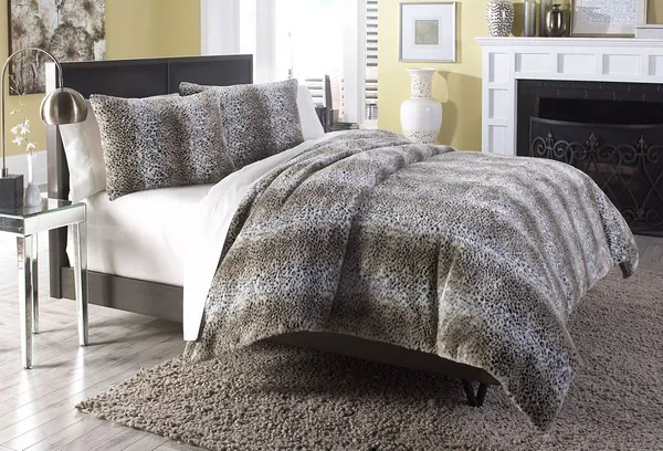 This chic faux fur, snow leopard pattern, duvet set adds modern warmth to any contemporary space. The plush woven fur fabric, complements any modern home style. Kasbah is available as a 3 piece Queen Set and King set. The Queen set includes standard shams, while the King includes King shams.