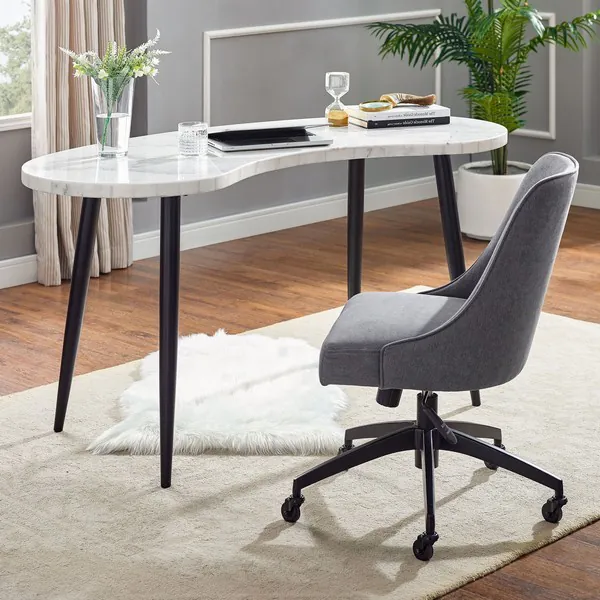 Up the style of your home office with the Kinsley marble top desk and office chair. This collection is built for style as well as function with a kidney shaped white marble top desk that will impress everyone. Exuding modern style, the Kinsley features canted legs the perfectly complement the mid century swivel tilt chair that completes the set. Enjoy your desk while you are working away with Kinsley.