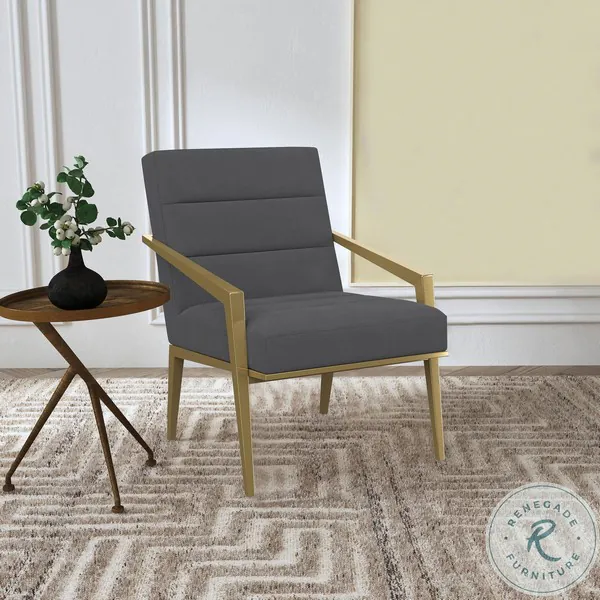 Restrained, modern style meets elegant artistry in a striking contemporary armchair. Designed to stand out, it boasts an upholstered seat and back with a metal frame and arms. The streamlined look receives a gleaming gold finish, adding sophistication anywhere from a sophisticated living room to a refined reception area in a professional space. Sloping, tapered arms define Its silhouette, creating an accent chair that's sure to stand out. Channel tufting accents foam cushions, creating a sense of depth and dimension you'll appreciate in any setting.