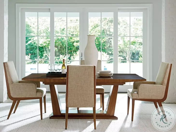 This fully upholstered arm dining chair design is available as shown in the Medford fabric 412412, a linen weave pattern in soft shades of ivory and taupe with an extremely soft hand. The elongated leg extends into the side for a dramatic flair. As with any dining chair, the rich hazelnut finish is available only as shown.Features