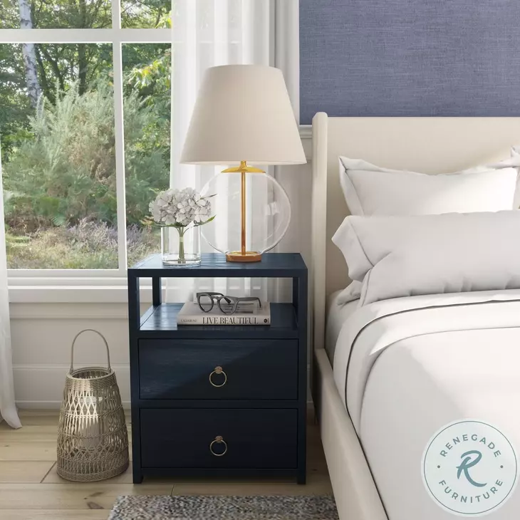 The minimalist design of this stylish nightstand makes it an ideal addition in any contemporary space. Crafted from acacia or pine wood solids and engineered wood products it features two drawers with ring pulls for a hint of glam and ball bearing glides for easy opening and closing. Just beneath the top is an open shelf for keeping essentials organized and within reach and it is a great spot to charge a phone or other device. It is suitable for use as an end table and is available in white navy and a neutral wire brush finishes.Features