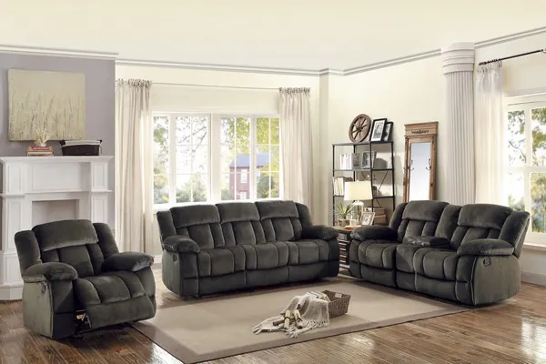 Generous seating combined with functional touches makes the Laurelton Collection the perfect addition to your living room. The double glider reclining loveseats center console features dual cup holders and hidden storage. Plush textured charcoal microfiber covers this amply appointed seating group.