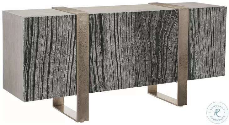 With Its flawless artistry and understated elegance Linea sets a new standard for rustic modern collections. In the stunning Linea entertainment console boldly patterned Black Forest marble and textured cast aluminum blend seamlessly in splendid style. The striking design features four push-to-open self-closing doors and a metal frame which wraps around the entire case. With Its deep charcoal background and snow-white striations the marble lends a high-end dramatic look to this functional piece.Features