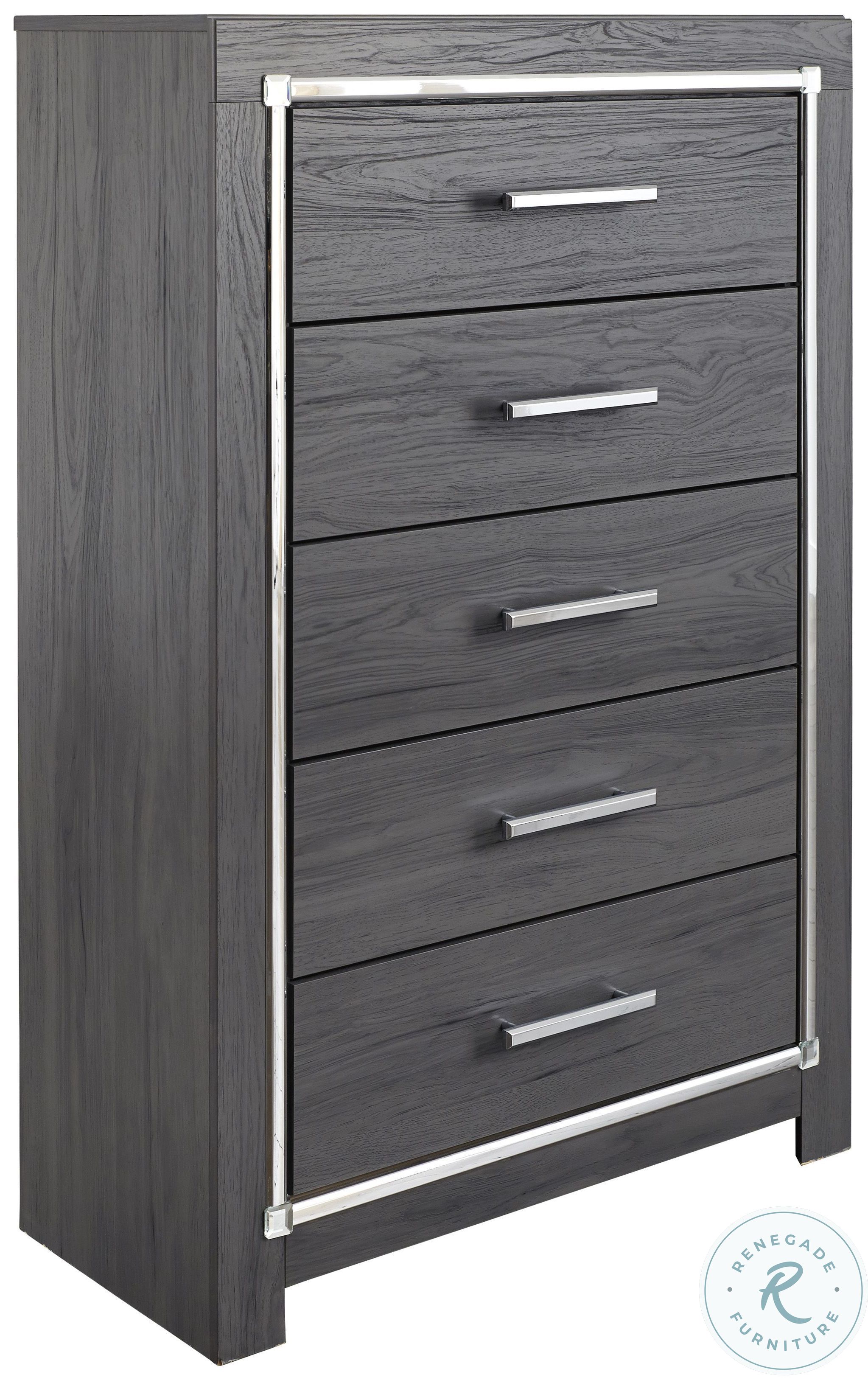Reminiscent of Hollywood glamour of yesteryear, the Lodanna chest of drawers interprets luxury in a decidedly modern way. Dazzling gray finish and faceted chrome-tone accents enhance the star power, while five smooth-gliding drawers provide enough storage to appease your inner diva.Features
