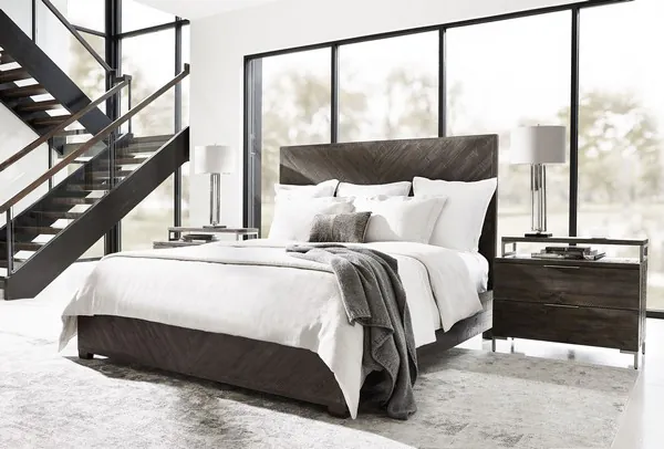 The Logan Square collection is casually sophisticated, combining modern minimalism with a cool retro sentiment and 70s revival style. Architectural structure and clean lines combine seamlessly with the organic tones of the Fuller bed. The moody Sable Brown finish adds a rich pop of texture to the fancy face headboard and footboard crafted from distressed pine. Expansive in style and size, this piece offers rustic appeal with a hip and edgy look.