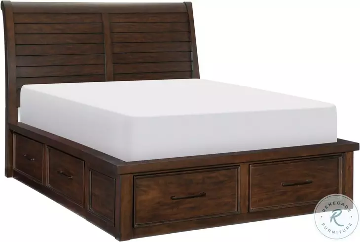 The transitional framing of the Logandale Collection allows for versatile placement within a number of classic bedroom decors, making a perfect choice for your home. A brown finish is utilized over mango veneer for subtle highlighting of its distinct grain. A total of 6 drawer units are located on the side rails and footboard of the California King size bed creating additional storage space within your bedroom. The sleigh headboard is paired with a platform footboard resulting in an unfettered design. Dark finished metal knob and pull hardware front each drawer creating a complementing accent to the drawer fronts.Features