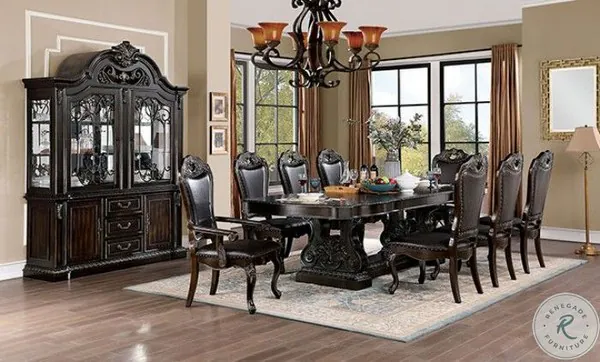 Ideal to fit any traditional space, this Lombardy Collection takes queues from classical design and incorporates them beautifully. Take for example the large table top, expanded by two 15 inch leaves. It sits atop an intricately designed trestle base with faux wood carvings reminiscent of age old styling. The chairs come in luxurious leatherette seats and backs with beautiful curved cabriole legs. Finally, the front panels of the optional hutch feature tempered glass covered in vine like details to match the foliage motif of the set.