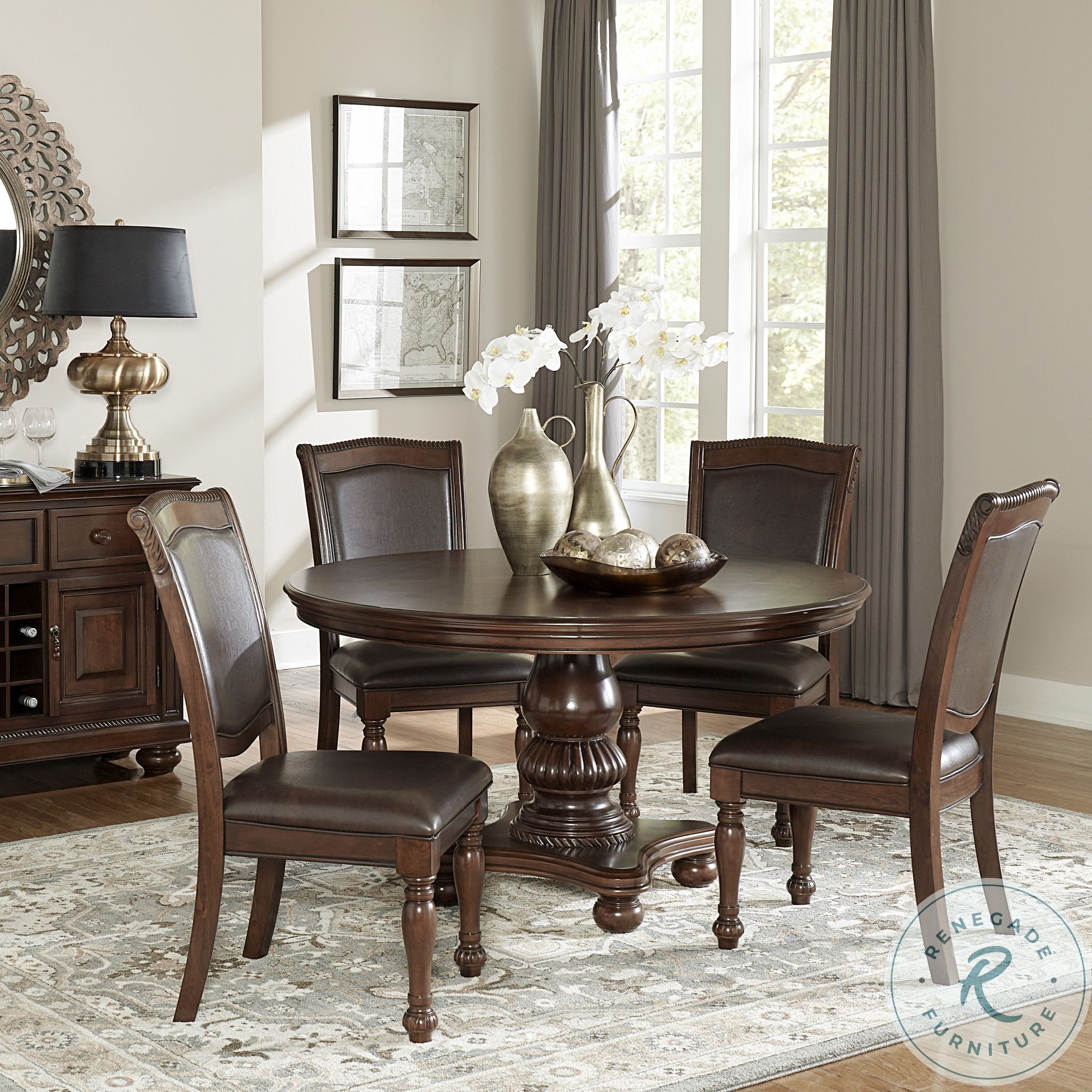Elegantly designed for the traditional dining room is the Lordsburg Dining Room Set. Supported by the pedestal base is the table’s round top where the magnificent parquet veneer is highlighted by the brown cherry finish that covers the collection. Heavily carved molding provides distinct accent to the table’s top while dark brown faux leather covers the seats and backs of the coordinating wood-framed chairs. The accompanying server provide ample storage space for your tabletop accessories.Features