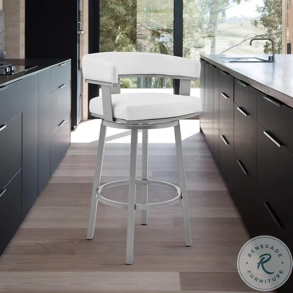 The unique style of the Lorin Swivel Bar Stool from Armen Living is unmatched whether it is the aesthetic or quality, it is hard to find a stool as wonderful as this. The contemporary round silhouette is unlike most bar stools and includes a wide, open lower back design for cool breathable seating. The Lorin Bar Stool can easily transition from your kitchen to your dining room, to your dining room to the living room, the versatile look makes these possibilities endless. The Lorin features a thick foam padded cushion that will keep you relaxed until you are ready to get up. This stool comes in your color choice of Black, Gray, and White Faux Leather.