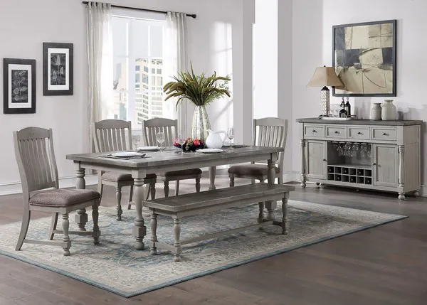 Gather around this new dining Lorraine Collection Your choice of rectangular dining table or a more casual round gathering table. This is made of solid pine along with your choice of two finishes options. You have the option of a two tone distressed gray over a weather distressed black, or a two tone antique gray over a distressed french gray finish. These colors will accent your dining decor. The dining table has a plank top and large turned style legs. The round gathering table has large turned legs with extra storage on the two shelves. The dining chairs and gathering chairs have shaped seating and an upholstered seat to sit in comfort with dining. There is also an accent dining bench that sits perfect with the dining table. The storage server comes with four drawers, shelves behind two doors, stemware holder, bottle rack and an open display shelf.