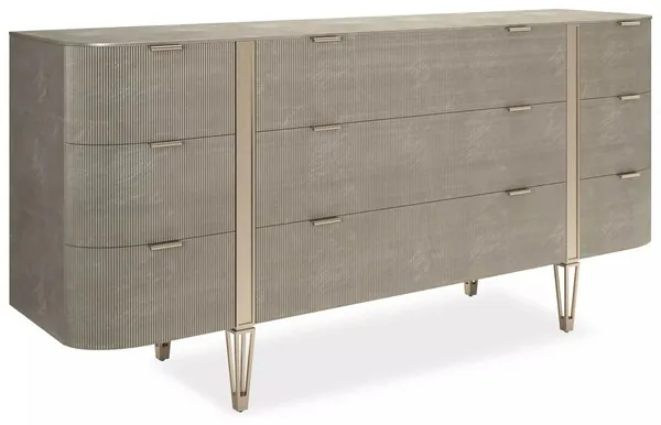 Love At First Sight has been elongated to 78 inches with two end doors with interior shelves and six center drawers. A full-covering of Matte Pearl accentuates the exquisite reeding on the fronts with Whisper of Gold metal band detailing and designer legs. The piece has a gracefully rounded rectangular profile. The drawers are felt-lined with under-mount guides.