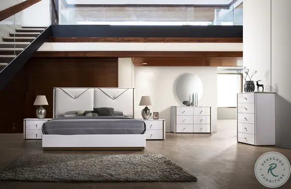The Lucera Bedroom Collection by JNM is the newest addition that redefines elegance. The soft leatherette upholstered headboard is designed with comfort and style, accented by gold rose embellishments. Each piece is framed in a contrasting bronze wood finish, and the gold handles are encrusted in crystals. The pure white lacquer finish is sure to compliment any home.