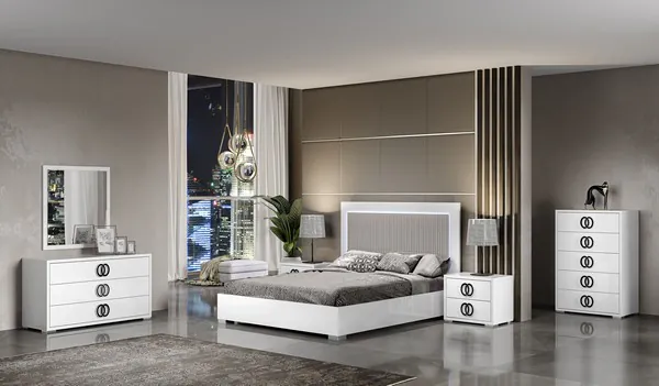 The Luxuria Bedroom collection by JNM Furniture is the new standard for posh modern. This bedroom, masterfully crafted in Italy, blends touches of modern and flashy aesthetic to create a timeless look perfect for any home. The white high gloss lacquer finish throughout the bed and case goods are complimented by the vertically tufted grey microfiber headboard. The additional LED light feature further highlights this centerpiece of a headboard. You will also find the Luxuria collection adorned with black gloss handles encompassed in chrome, and chrome feet throughout.