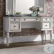 Start your mornings off by utilizing this charming vanity desk. The weathered brown whitewash top paired with the antique white finish and antique pewter knob hardware creates a truly unique look. Five full extension fully stained drawers allow you to store all your accessories, with two dividers located in the side drawers to help with organization. This unique piece is the perfect finish touch to any space.Features