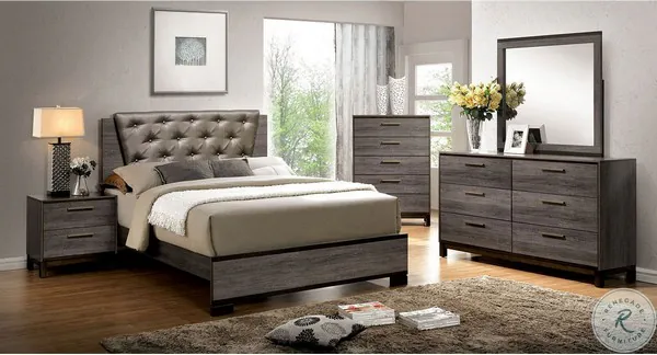 If you're into the unconventional, this unique bed might be right up your alley. Underlying wooden structure of the headboard is stylishly exposed, while a V-shaped section is padded and upholstered with leatherette. Add button tuftings for good measure. The footboard and case goods also feature a two-tone antique gray finish with black borders.