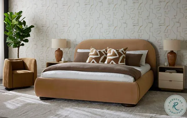 A visual embodiment of softness, the Marin Collection from Sunpan brings mesmerizing curves to the bedroom. Smooth to the touch with a well-padded headboard, this alluring bed is upholstered in velvety kona camel fabric with a low profile elevated on round solid oak wood legs.