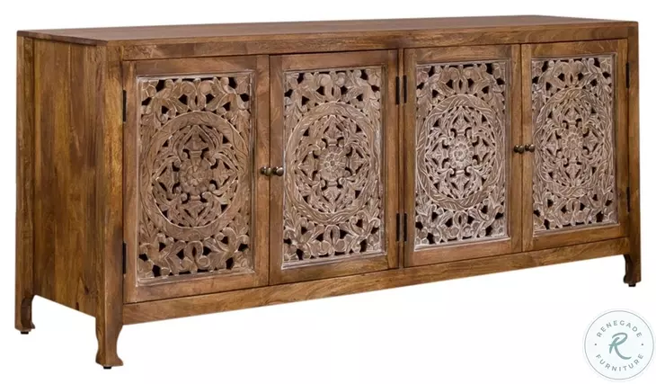 Marisol 74†accent TV console gives you that Boho chic feel that is so popular today. Boho is a mix of colors styles and materials to create a carefree casual comfortable space. Crafted of solid mango in a weathered honey finish with hand brushed cream hang-up on cravings. Features four artisan hand carved doors in a floral pattern one fixed shelf behind each door shaped block legs with antique brass knob hardware. Perfect as a TV console.Features