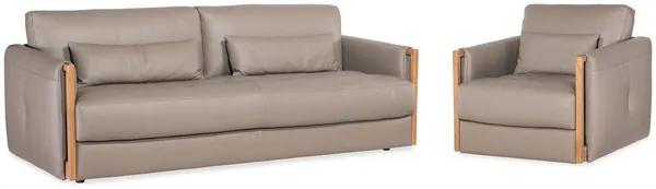 In a light and airy modern style, the Meridian Collection has exposed wood trim on the arm fronts and is covered in the soft-colored Miami Truffle semi-aniline top grain leather, accented by designer topstitch trim and a comfortable kidney pillow.