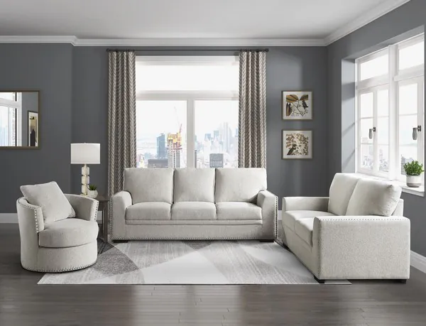 A perfect addition to your casual living room, the Morelia Collection’s functionality goes beyond that of a traditional sofa. Covered in dark gray chenille, the modern profile of this seating group is defined by its loose back cushions and track style arms. Conveniently stored beneath the sofa is a pull out trundle that rises to create a bed while the top of the attached chaise opens to reveal under seat storage. The chaise and paired two seater can be configured as right or left side placement based on the needs of your space. A coordinating swivel chair lends complementing decorative accent with its barrel shape and loose back cushion.