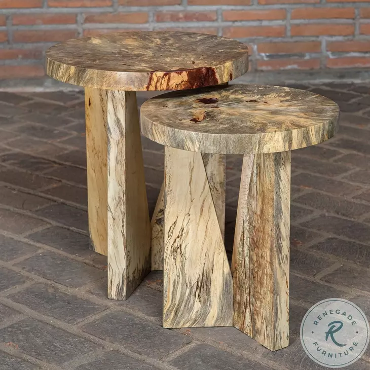 Made from solid tamarind wood, this set of two nesting tables features strong angular lines with beautiful spalting in a neutral finish. Solid wood will continue to move with temperature and humidity changes, which can result in cracks and uneven surfaces, adding to its authenticity and character. Sizes: Sm-16x19x16, lg-18x22x18Features