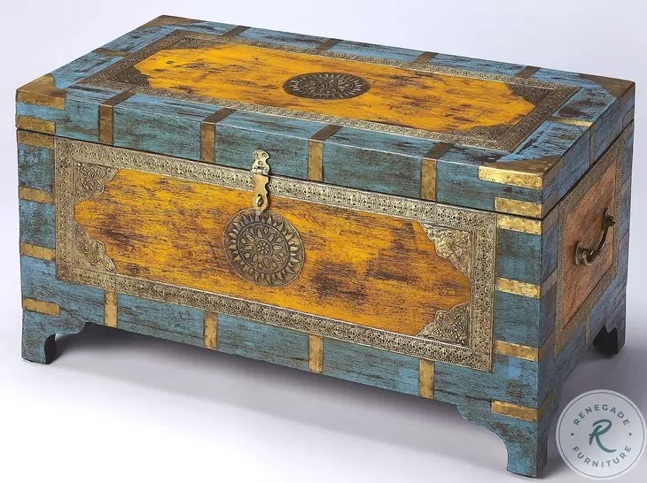 Intricately designed with brass inlays and blue and gold hand painting this unique storage trunk has a vintage feel. Handcrafted from mango wood solids it has a hinged lid that opens for spacious interior storage.Features