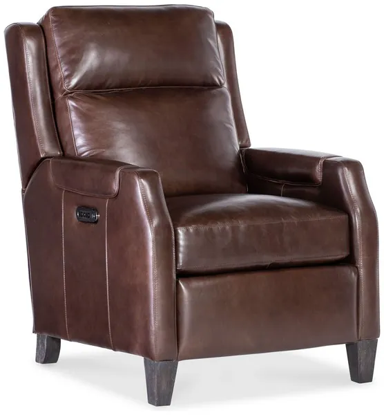 Transform your living space with the Nelson Power Recliner from Hooker Furniture Upholstery. Crafted in luxurious Dark Roast semi-aniline leather, this transitional recliner combines sophisticated design with advanced functionality. Featuring power recline and a power headrest, it ensures personalized comfort at the touch of a button. The tapered wood legs and bustle-style back add to its elegant silhouette, while padded slope arms provide additional support. Elevate your décor with this meticulously crafted piece that blends timeless style with contemporary convenience.