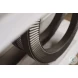 The Wayfarer console has a white veneered Santa Cruz marble top in a leathered finish, supported by decorative circle motifs in a burnished pewter coloration, on a Santa Cruz marble base.Features