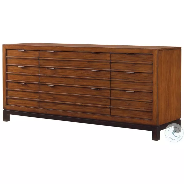 The nine drawer dresser provides four size drawers for wardrobe organization. The extended tab pulls visually blend into the design yet reflect the darker finish on the parsons leg base finish in a rich walnut.Features