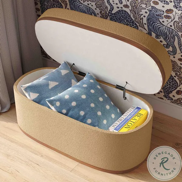 Add a textural touch to your living space with the versatile Olivier Oval Storage Ottoman, available in lush peach or ivory boucle or a captivating tribal cotton pattern. Featuring a tilting lid for convenient storage, this ottoman is wrapped in textured fabrics and accentuated with elegant acacia trim. The cotton option, adorned with a large tribal pattern in beautiful earthy tones, effortlessly enhances any space with its rich, bohemian flair, while the finished interior offers a refined touch.